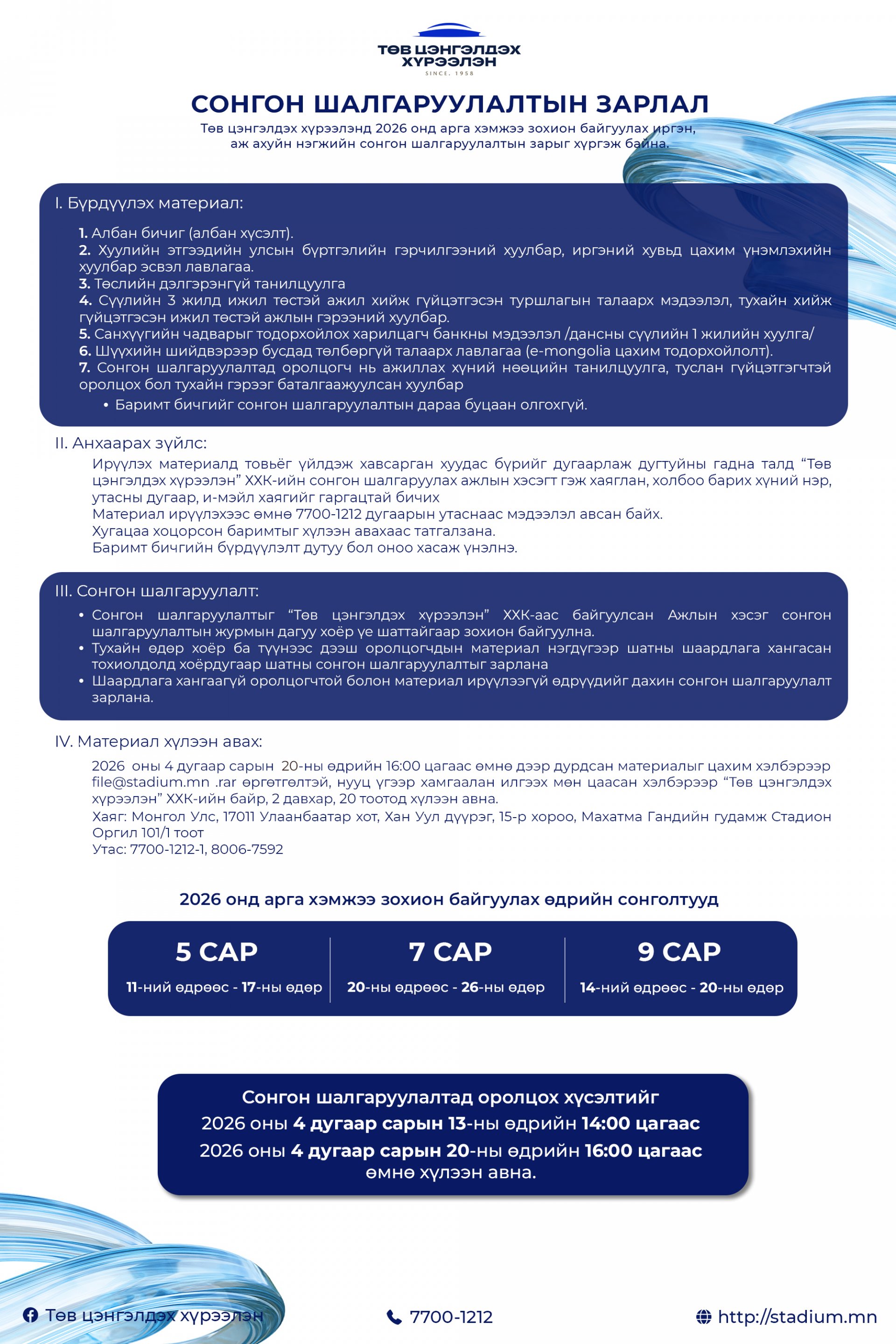 Сонгон шалгаруулалтад оролцох хүсэлт, материалыг 2026 оны 4 дүгээр сарын 13-ны 14:00 цагаас 4 дүгээр сарын 20-ны 16:00 цаг хүртэл хүлээн авна.