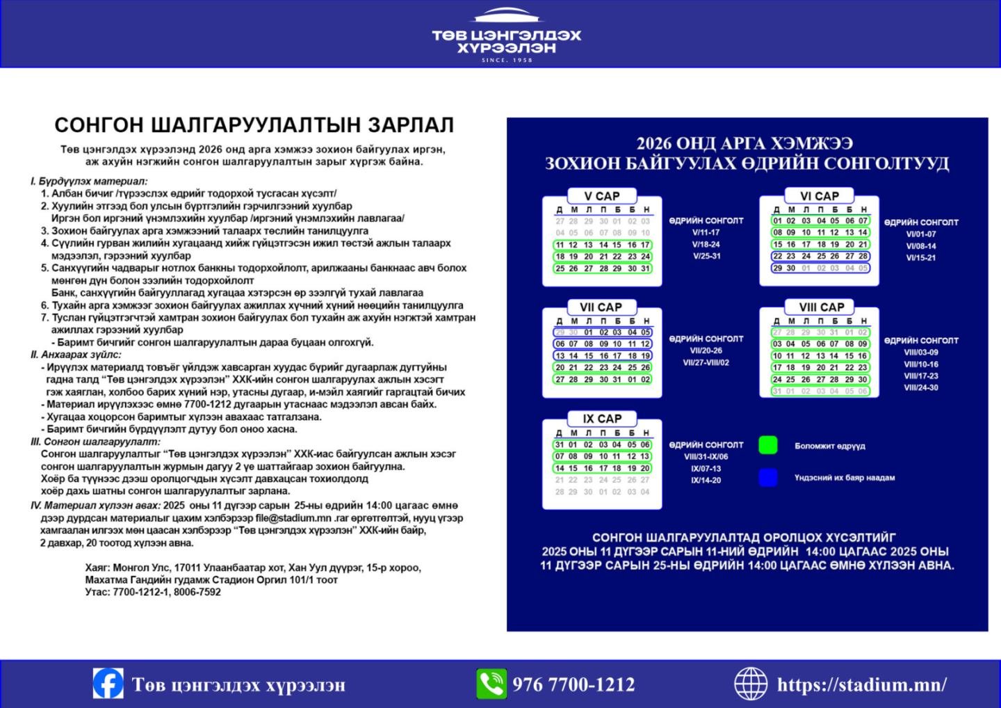 Төв цэнгэлдэх хүрээлэнд 2026 онд олон нийтийн арга хэмжээ, соёл, урлаг, спортын үйл ажиллагаа зохион байгуулах иргэн, аж ахуйн нэгжийг сонгон шалгаруулах зарыг хүргэж байна.
